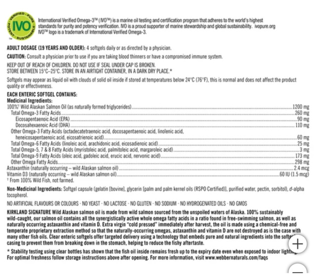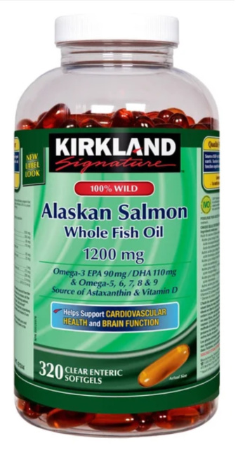 Риб'ячий жир аляскинського лосося Kirkland Signature є джерелом омега-3 жирних кислот, а також інших омега-жирних кислот, вітаміну D та астаксантину - все це в кишковорозчинних м'яких капсулах для підтримки гарного здоров'я.